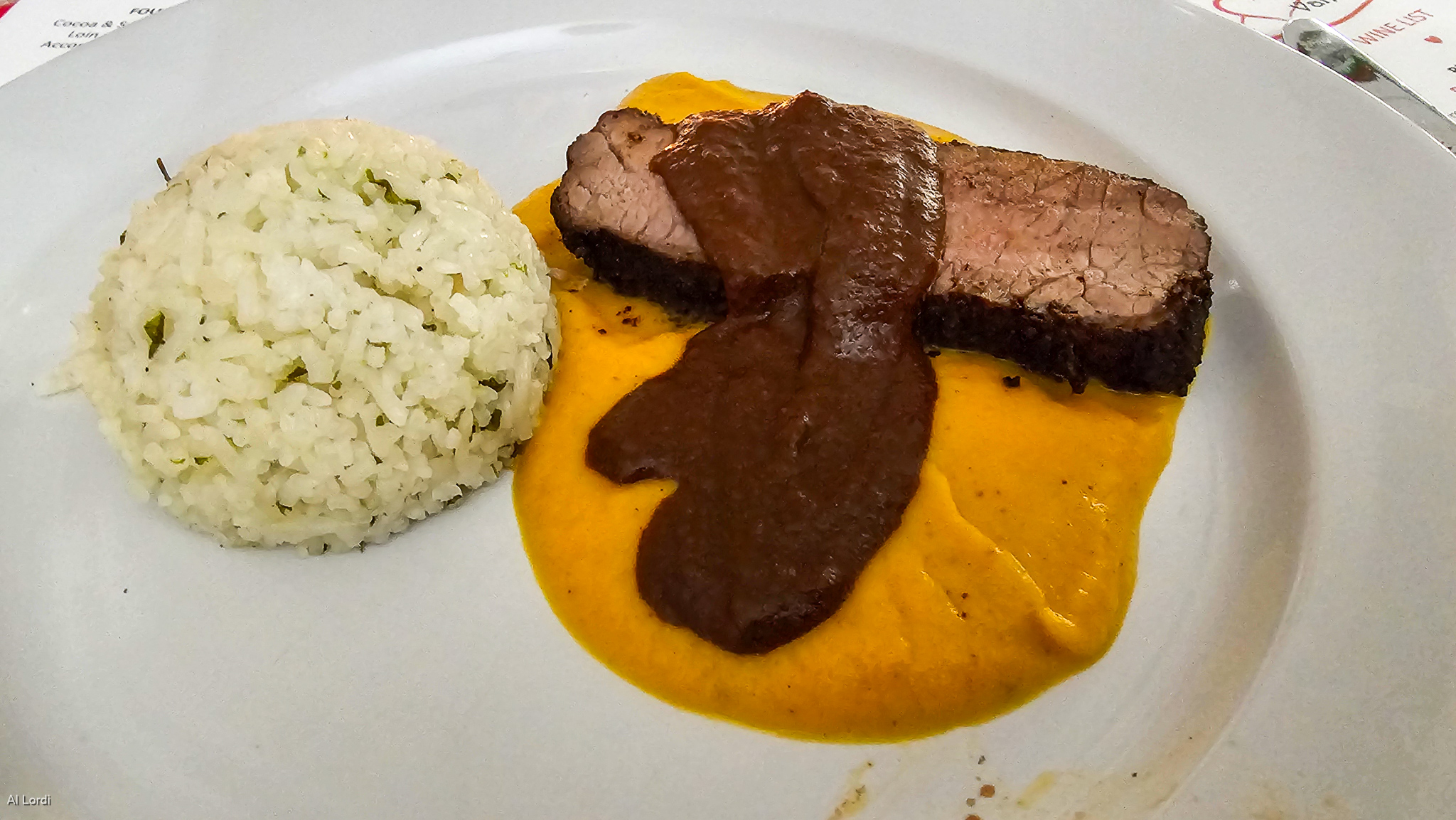 4th Course-Cocoa and spice rubbed Bison Strip Loin with a Traditional Mole, a Veggie and Mexican Rice Copyright Al Lordi