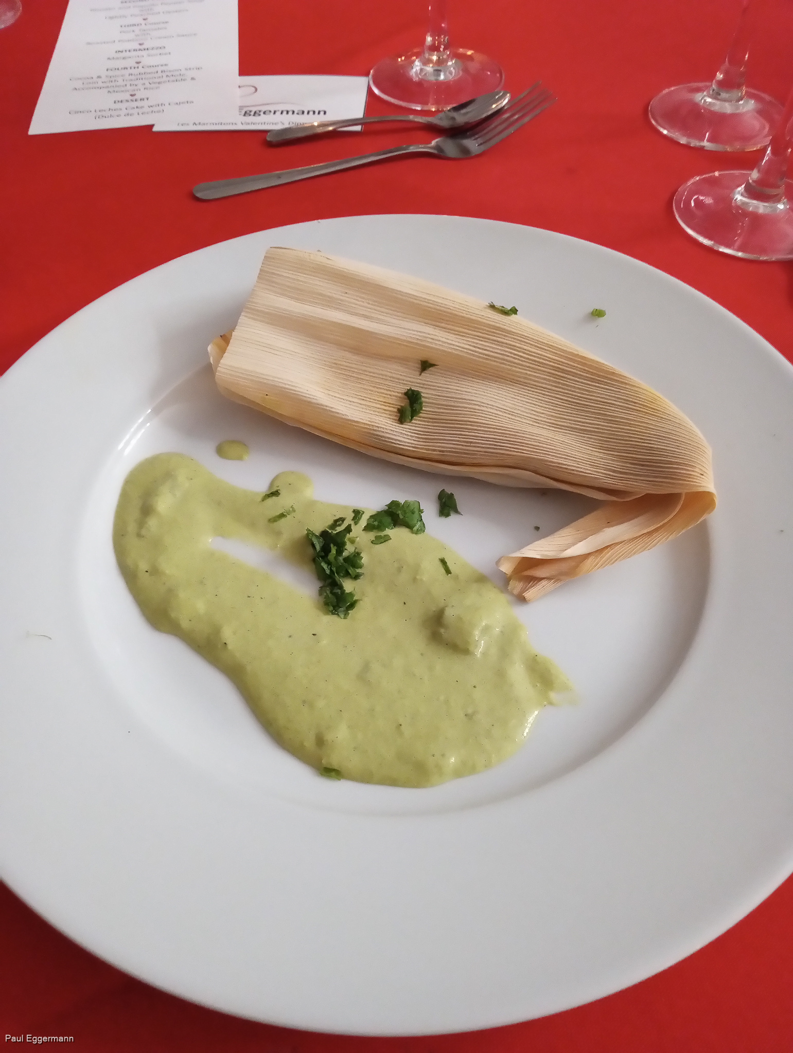 3rd Course-Pork Tamales with a Roasted Poblano Cream Sauce Copyright Paul Eggermann
