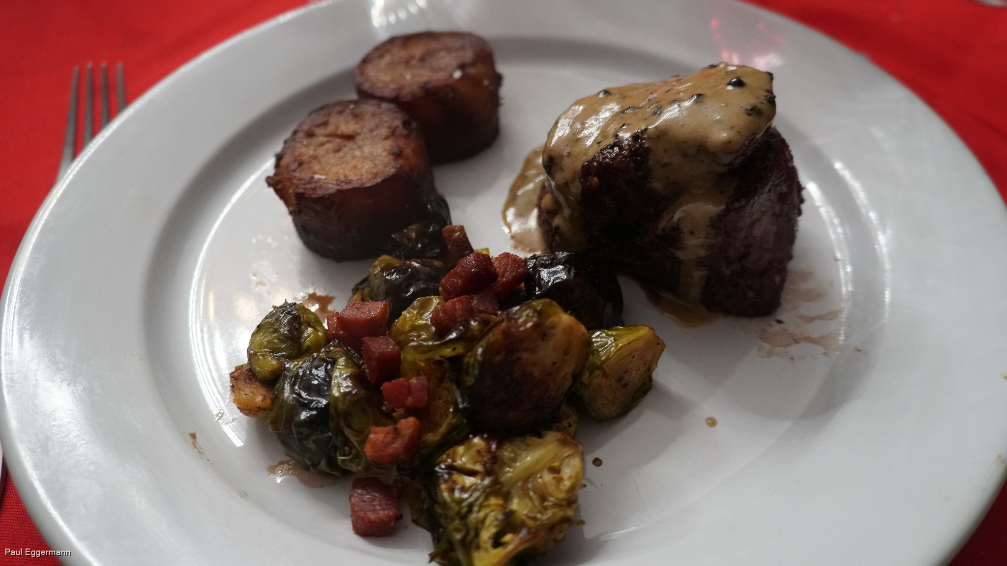 - Main - steak au poivre, roasted brussels sprouts and fondant potatoes